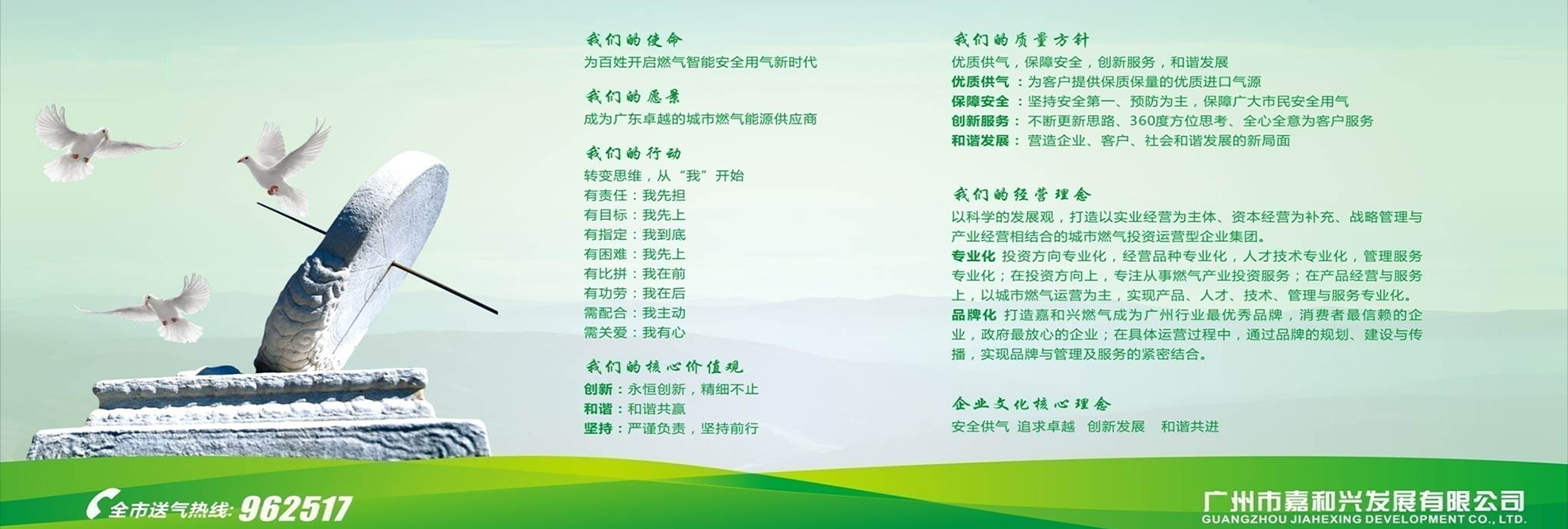 ——廣州市嘉和興發(fā)展有限公司于2001年3月1日注冊成立,主要從事瓶裝液化石油氣(LPG)批發(fā)貿易,民用、工業(yè)用液化石油氣,工業(yè)用氣體,汽車加氣站及危險品物流運輸?shù)?,總部設在廣州。目前公司經營三個液化氣充裝站、一個汽車加氣站:白云區(qū)神山達嶺液化石油氣站、白云區(qū)加禾氣站和佛山市南海區(qū)冠順氣站,黃埔區(qū)塘口汽車加氣站,總庫容接近800立方米。